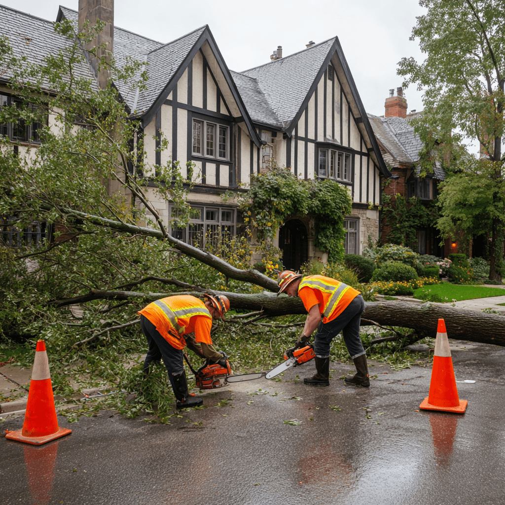 Emergency situations on estate properties in The Kingsway and Humber Valley Village require a level of response capacity that standard residential emergencies do not. The trees are larger, the potential consequences of a major limb failure or root ball uproot are greater, and the access complexity of some of these properties, with gated driveways, mature specimen trees throughout the grounds, and ravine-edge topography at the rear, means that emergency operations need to be planned carefully even under time pressure.