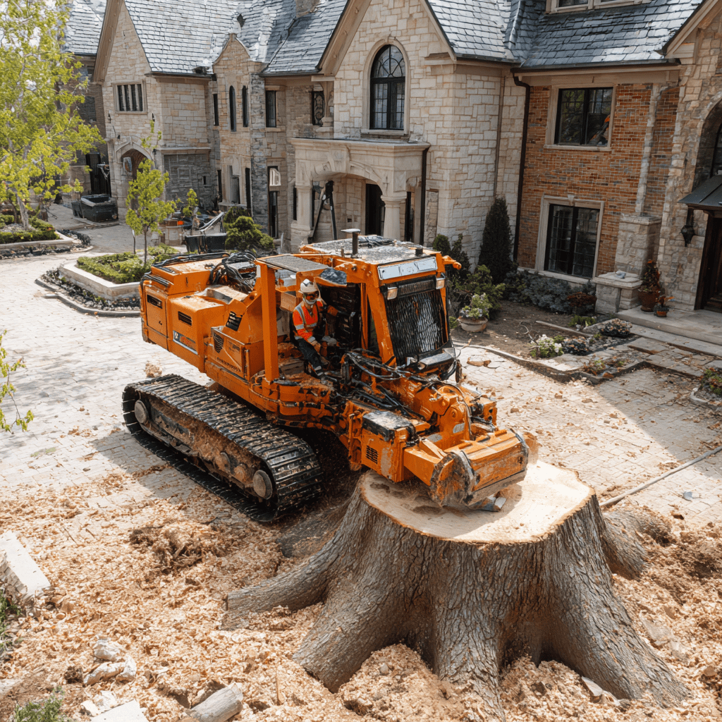 For tight backyards and gated properties in areas like Milliken Mills, Wismer Commons and Box Grove, our compact tracked grinder fits through a standard 36-inch gate opening and can manoeuvre in confined spaces without damaging lawn or fencing. For large stumps on open properties in Unionville, Angus Glen and Cachet, our full-size commercial grinder makes faster work of large root flares and multiple stumps in a single visit.
