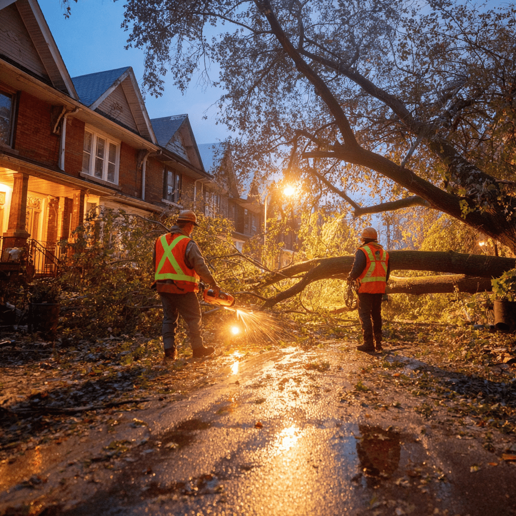 North York takes a specific kind of storm hit. The district sits in the path of lake-effect weather systems that track northeast from Lake Ontario, and the combination of large old trees, wide open estate lots that provide no wind shelter for individual specimen trees, and the wind channel effect of the Don Valley corridor means that significant summer and fall storms regularly cause major tree failures across the district. The December 2013 ice storm that devastated Toronto's urban canopy hit North York particularly hard, with the large-limbed estate oaks and maples in Bridle Path, York Mills and St. Andrew-Windfields carrying ice loads they were not structurally equipped to survive.