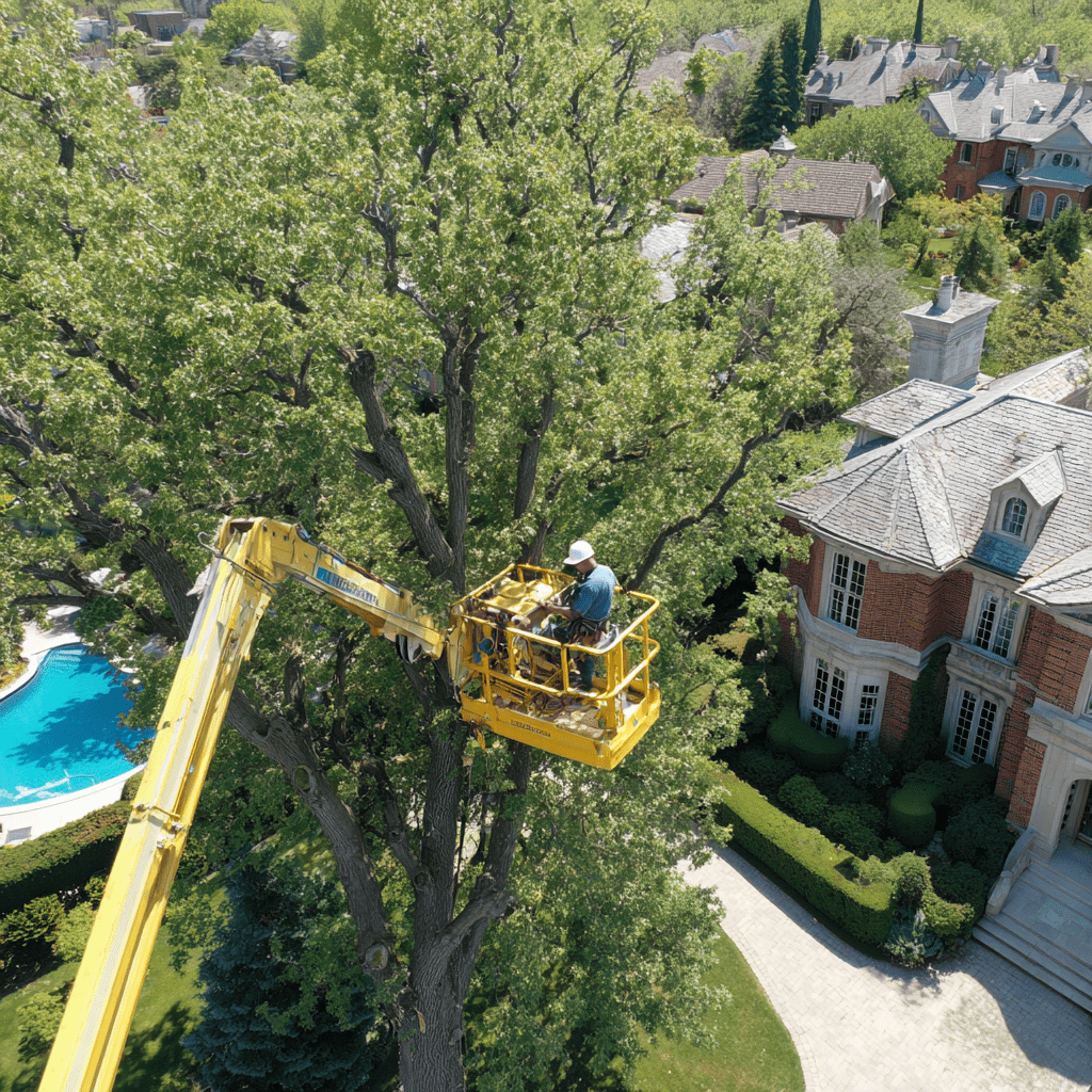 ISA certified arborist in aerial lift bucket pruning a large white oak in a Bayview Hill Richmond Hill yard